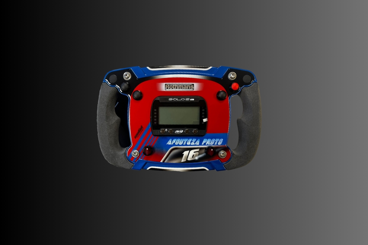Volante MRSformula personalizado para integración directa con AIM Solo2. Fabricado en Barcelona. Construcción en carbono, grips desmontables y compatibilidad con bujes de 6 tornillos.